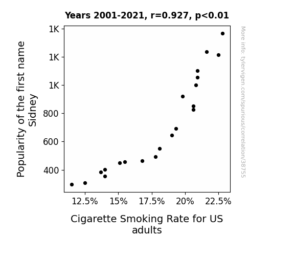 This means 86% of the change in the one variable (i.e., Cigarette Smoking Rate for US adults) is predictable based on the change in the other (i.e., Popularity of the first name Sidney) over the 21 years from 2001 through 2021.