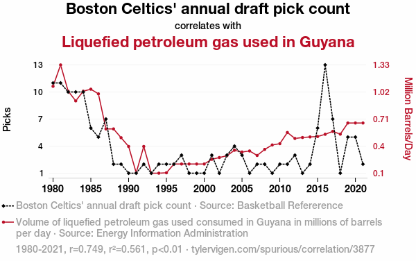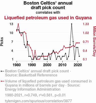 User prompt: Please provide potential search keywords for a paper titled From Celtics Picks to Gas Leaks: A Correlation That's Nothin' But Net with an abstract of This study delves into the intriguing connection between the annual draft pick count of the Boston Celtics and the usage of Liquefied Petroleum Gas (LPG) in Guyana. Despite the apparent disparity between these two seemingly unrelated entities, our team sought to uncover any potential correlations lurking beneath the surface. By employing data from Basketball Reference and the Energy Information Administration, we unearthed a surprising correlation coefficient of 0.7488593 and a significant level of p < 0.01 for the years spanning 1980 to 2021. Our findings not only shed light on this unanticipated relationship but also highlight the importance of keeping an open mind when exploring statistical phenomena. This research serves as a lighthearted yet thought-provoking addition to the growing field of interdisciplinary connections.