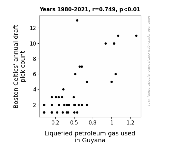 This means 56.1% of the change in the one variable (i.e., Liquefied petroleum gas used in Guyana) is predictable based on the change in the other (i.e., Boston Celtics' annual draft pick count) over the 42 years from 1980 through 2021.