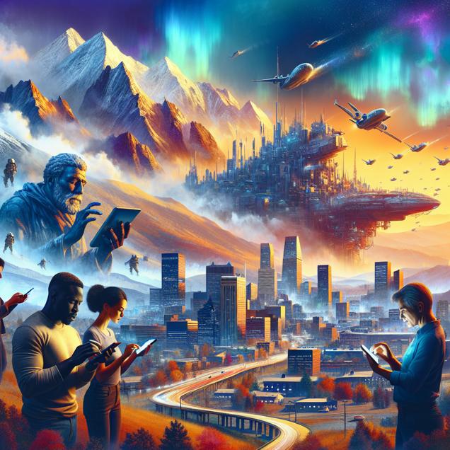 ChatGPT: Generate an image of a futuristic cityscape set in Boulder, with smog and pollution obscuring the view of the mountains. In the foreground, depict people absorbed in their futuristic high-tech devices, creating a juxtaposition between the natural beauty of the mountains and the artificial and immersive world of technology. The scene should convey a sense of urgency and escapism as people frantically search for information about the Titanic, capturing the blend of nature and modern technology in a visually compelling manner.