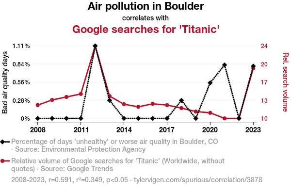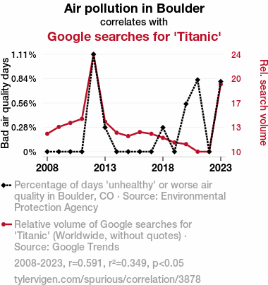 - The spurious research paper: The Air-ifying Affair: Unveiling the Connection Between Air Pollution in Boulder and Google Searches for 'Titanic'