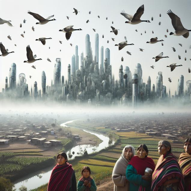 Prompt: Prompt: Generate an image of a futuristic cityscape with heavy smog covering Milwaukee's skyline. In the sky, geese are seen flying off course, dropping kerosene canisters as they migrate. Meanwhile, in a rural area of Peru, depict locals looking up in surprise as the unexpected canisters fall from the sky, raising concern about the impact of kerosene usage. The image should capture the contrast between the futuristic city and the natural landscape, conveying a sense of environmental imbalance and human intervention. The depiction should include only scenes, people, and objects, it should not include text or speech bubbles.
