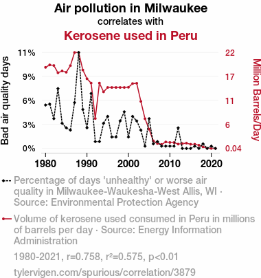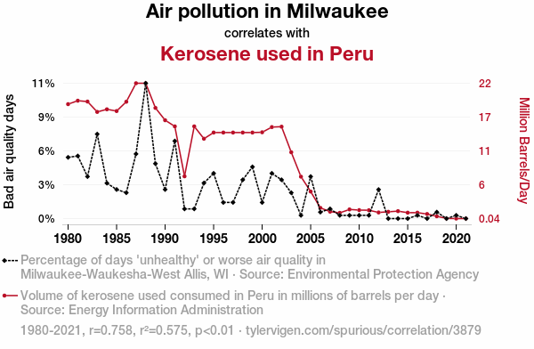 - The spurious research paper: The Rhyme and Reason of Air Pollution Season: A Comical Correlation between Milwaukee's Smog and Peru's Kerosene Fog