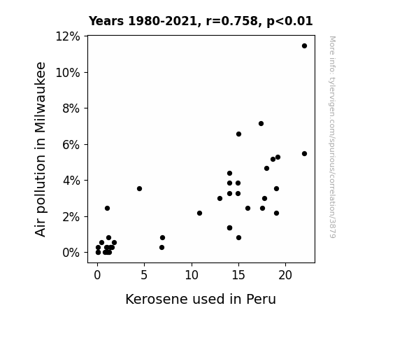 This means 57.5% of the change in the one variable (i.e., Kerosene used in Peru) is predictable based on the change in the other (i.e., Air pollution in Milwaukee) over the 42 years from 1980 through 2021.
