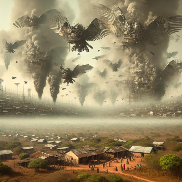 ChatGPT: In Seneca, South Carolina, thick smog hangs over the town, as a group of migratory birds fly southward overhead. A few of the birds drop small packages of jet fuel from their beaks, which land in a clearing in Burkina Faso, next to a small village.