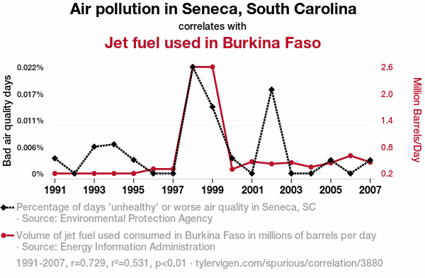 A linear line chart with years as the X-axis and two variables on the Y-axis. The first variable is Air pollution in Seneca, South Carolina and the second variable is Jet fuel used in Burkina Faso.  The chart goes from 1991 to 2007, and the two variables track closely in value over that time. Small Image