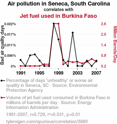 2. Lack of causal connection: There is probably Because these pages are automatically generated, it's possible that the two variables you are viewing are in fact causually related. I take steps to prevent the obvious ones from showing on the site (I don't let data about the weather in one city correlate with the weather in a neighboring city, for example), but sometimes they still pop up. If they are related, cool! You found a loophole.