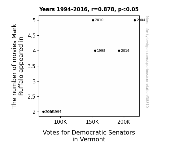 This means 77.2% of the change in the one variable (i.e., Votes for Democratic Senators in Vermont) is predictable based on the change in the other (i.e., The number of movies Mark Ruffalo appeared in) over the 6 years from 1994 through 2016.