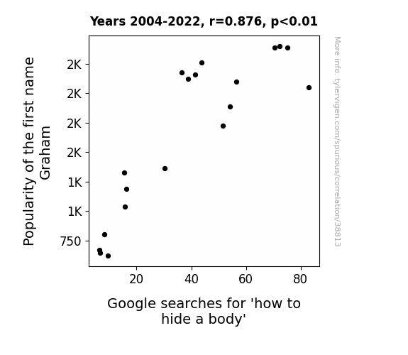 This means 76.7% of the change in the one variable (i.e., Google searches for 'how to hide a body') is predictable based on the change in the other (i.e., Popularity of the first name Graham) over the 19 years from 2004 through 2022.