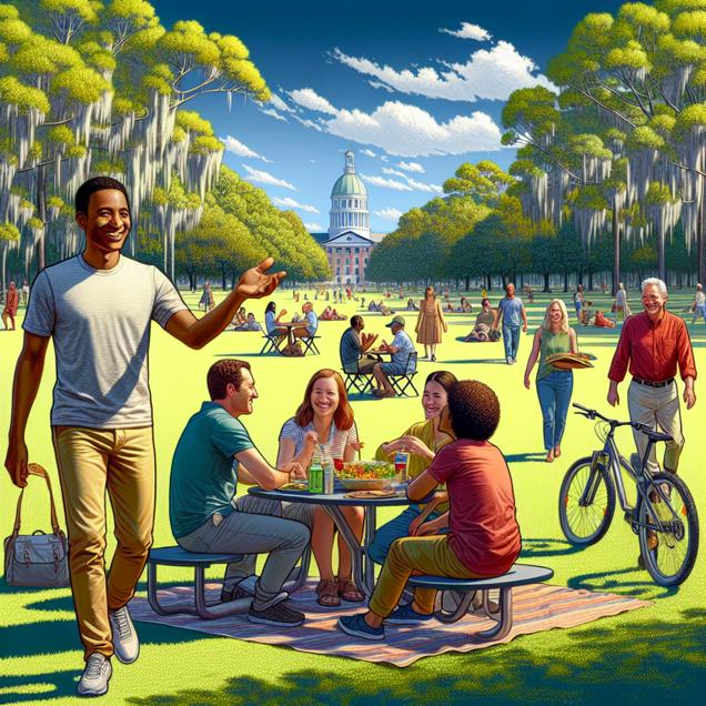 Prompt: Generate an image of a serene park in Tallahassee, with clear blue skies and lush greenery. There are people enjoying the fresh air, engaging in various activities such as walking, cycling, and picnicking. In the center of the scene, a group of individuals can be seen chatting animatedly in Spanish, their expressions joyful and relaxed. The atmosphere exudes harmony and a sense of community as people connect with each other in a language they have become proficient in, grateful for the improved air quality. The depiction should include only scenes, people, and objects, it should not include text or speech bubbles.