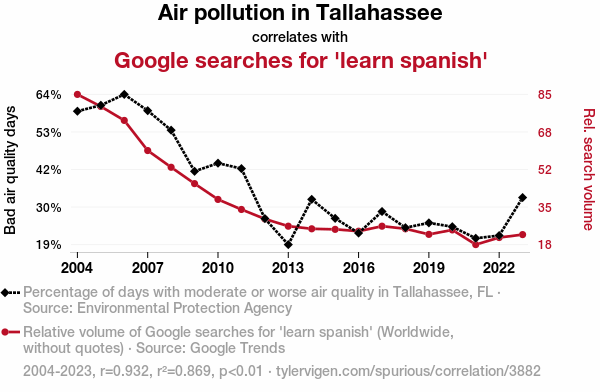 - The spurious research paper: Smoggin' Spanish: Unraveling the Relationship between Air Pollution in Tallahassee and Google Searches for 'Learn Spanish'