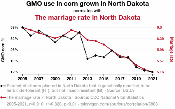 - The spurious research paper: The Marriage Muddle: Mapping the Marriage Market and Genetically Modified Corn Growth in North Dakota