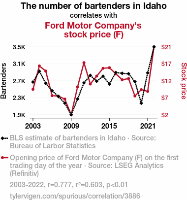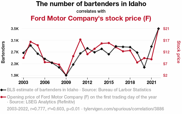 bartender employment, Idaho, stock price correlation, Ford Motor Company, market influences, unconventional variables, financial markets, correlation coefficient, stock price analysis, labor statistics, LSEG Analytics, Refinitiv, 2003-2022