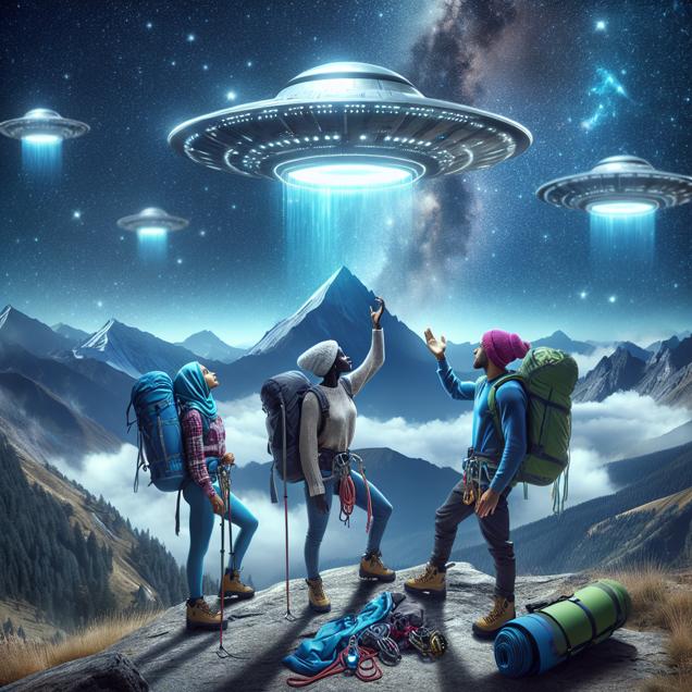 ChatGPT: Create an image that looks like a scene from 'Star Wars,' depicting a group of mountaineers in the serene mountains of Georgia, spotting a cluster of UFOs hovering gracefully in the night sky. The mountaineers are in awe, with their gear at their feet and the majestic mountain peak in the background. The UFOs serve as a catalyst for the mountaineers' determination to reach the summit, echoing the growing number of successful climbs of the world's highest peak. The backdrop includes twinkling stars and a serene, otherworldly atmosphere.