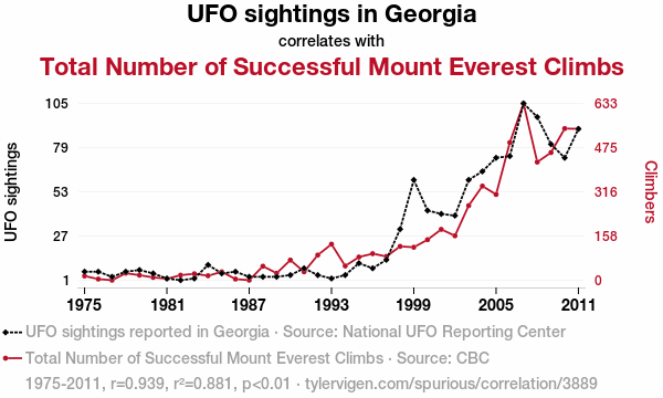 User prompt: Please make up a funny explanation for how an increase in UFO sightings in Georgia caused Total Number of Successful Mount Everest Climbs to increase. Add a funny one-liner at the end.