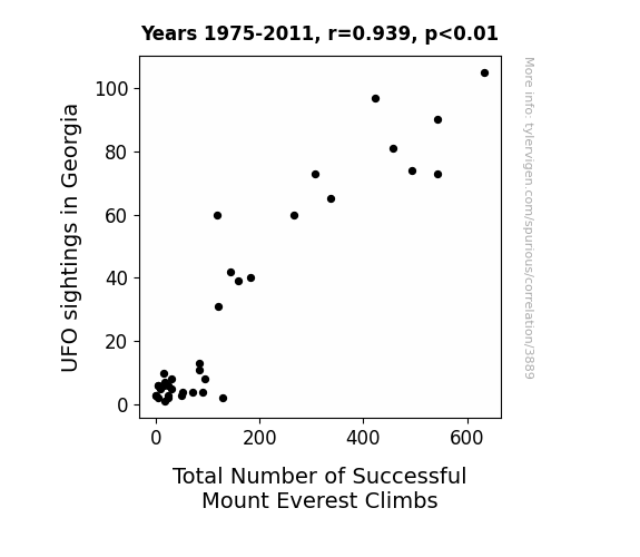This means 88.1% of the change in the one variable (i.e., Total Number of Successful Mount Everest Climbs) is predictable based on the change in the other (i.e., UFO sightings in Georgia) over the 37 years from 1975 through 2011.