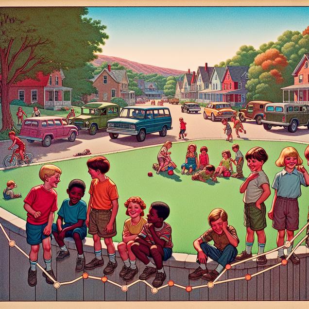 Prompt: Create an endearing illustration of a quaint Pennsylvania town playground bustling with joyous children, as a decreasing popularity chart with "Johnathon" written boldly at the top is displayed in the foreground. Meanwhile, a row of parked cars in the background exhibits a declining trend in theft incidents, with fewer mischievous "Johnathon" named youngsters eyeing them. The charming artwork should capture the innocence and whimsy of childhood, while subtly hinting at the narrative through clever visual cues. The depiction should include only scenes, people, and objects, it should not include text or speech bubbles.