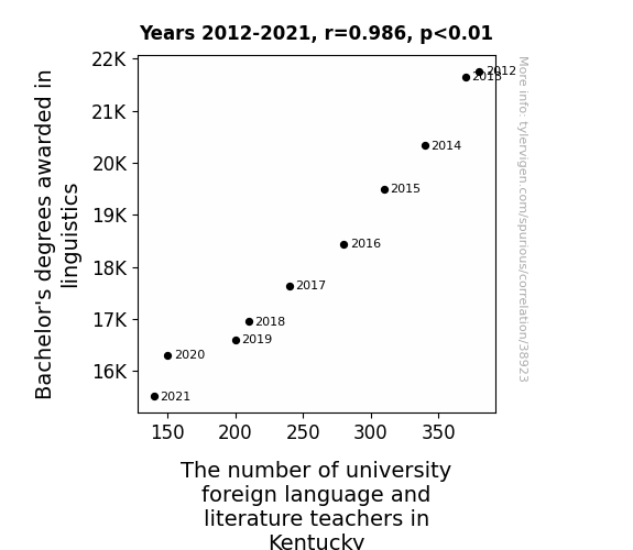 This means 97.2% of the change in the one variable (i.e., The number of university foreign language and literature teachers in Kentucky) is predictable based on the change in the other (i.e., Bachelor's degrees awarded in linguistics) over the 10 years from 2012 through 2021.