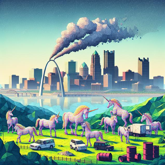 ChatGPT: [ Air pollution in St. Louis: Low poly ] In a low-polygon style, create an image of a hazy skyline of St. Louis. A heavy smog looms over the city, with stylized cars emitting thick plumes of exhaust. In the outskirts, depict a group of unicorns with shimmering coats grazing peacefully in a lush green field in Denmark. These unicorns consume petroleum spills from old barrels, which are now abundant due to a decrease in petroleum consumption.
