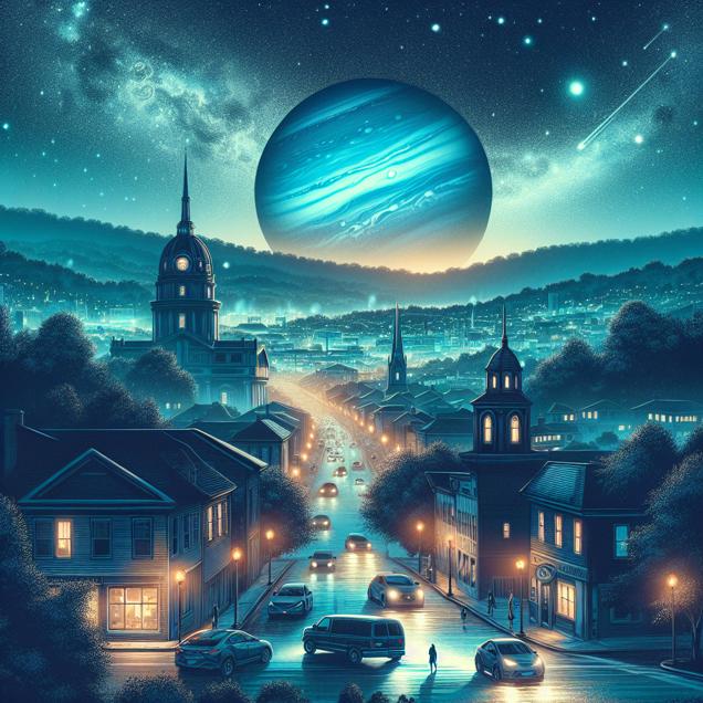 Prompt: Create a serene and captivating visual of Parkersburg, West Virginia, under the celestial glow of a clear night sky. In the backdrop, the distant planet Neptune shines brightly, its blue hue casting a mesmerizing aura over the cityscape. Meanwhile, the streets are depicted with a few cars, as the community embraces sustainable transportation by carpooling to reduce air pollution. The scene evokes a sense of environmental consciousness, seamlessly blending the cosmic wonder of Neptune with the harmonious efforts of the city's inhabitants to preserve the planet. The depiction should include only scenes, people, and objects, it should not include text or speech bubbles.