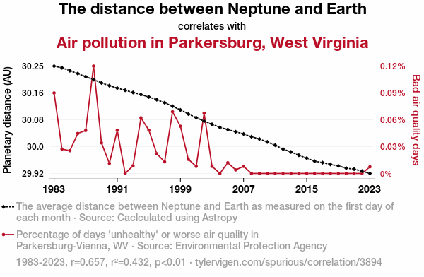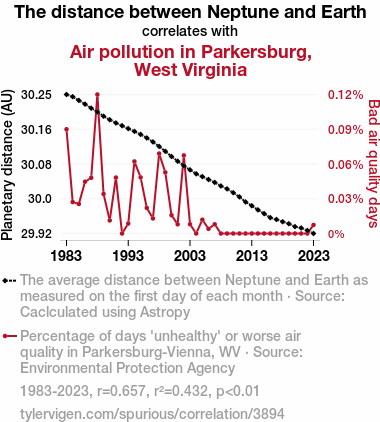 This means 43.2% of the change in the one variable (i.e., Air pollution in Parkersburg, West Virginia) is predictable based on the change in the other (i.e., The distance between Neptune and Earth) over the 41 years from 1983 through 2023.