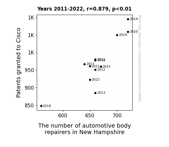 This means 77.3% of the change in the one variable (i.e., The number of automotive body repairers in New Hampshire) is predictable based on the change in the other (i.e., Patents granted to Cisco) over the 12 years from 2011 through 2022.