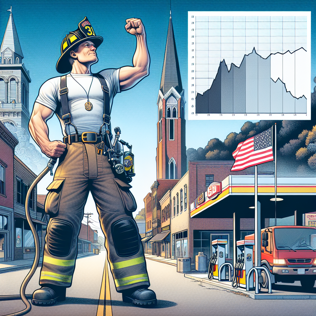 Prompt: Generate an image of a firefighter in a small Missouri town raising a triumphant fist in the air as a graph chart in the background shows a downward trend in arson incidents. In a bustling United Kingdom city, depict a petrol station with noticeably less crowded petrol pumps, indicating a reduced demand for gasoline due to the decrease in arson cases. Both scenes should be visually distinct yet connected, perhaps through subtle cues like a map or flag. The depiction should include only scenes, people, and objects, it should not include text or speech bubbles.