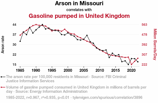 This means 93.5% of the change in the one variable (i.e., Gasoline pumped in United Kingdom) is predictable based on the change in the other (i.e., Arson in Missouri) over the 38 years from 1985 through 2022.