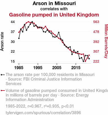 arson cases, Missouri, gasoline consumption, United Kingdom, correlation coefficient, FBI Criminal Justice Information Services, Energy Information Administration, arson statistics, gasoline usage, fire incidents, crime data