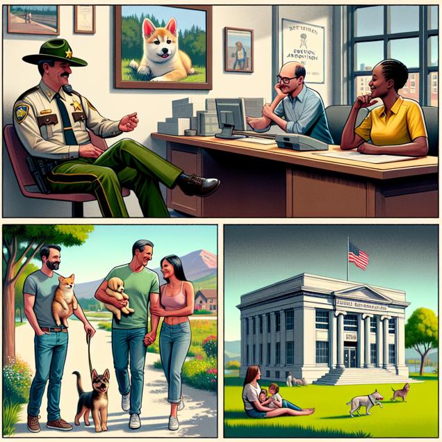Prompt: Prompt: A serene Idaho town scene with a dark twist. The local bank appears idyllic, with the sheriff casually conversing with tellers. In the park, couples are tenderly holding their newly adopted pets, radiating joy. Unsettlingly, the U.S. intercountry adoption agency office next door looks eerily empty, hinting at the decrease in human adoptions. The depiction should include only scenes, people, and objects, it should not include text or speech bubbles.