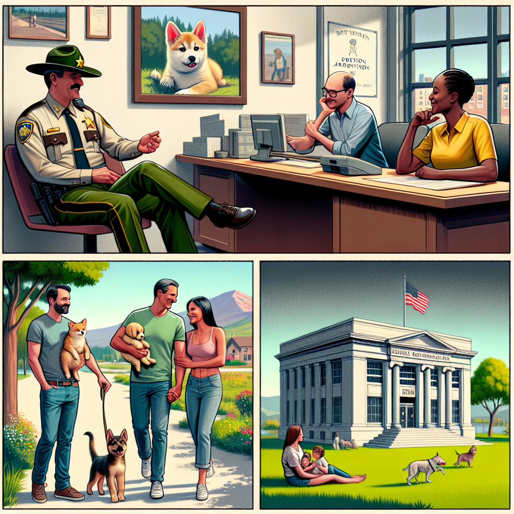 User prompt: Please describe a visual scene that prominently depicts both Robberies in Idaho and U.S. intercountry adoptions, in the following situation: Because as robberies decreased in Idaho, would-be thieves had to find other ways to steal hearts, leading to a surge in romantic gestures and couples adopting furry companions instead of human children. This unexpected shift in priorities caused a decrease in U.S. intercountry adoptions.. Keep the description simple.