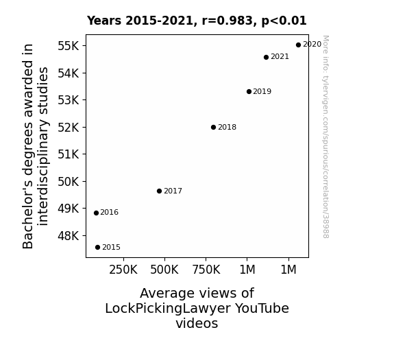 A linear line chart with years as the X-axis and two variables on the Y-axis. The first variable is Bachelor's degrees awarded in interdisciplinary studies and the second variable is Average views of LockPickingLawyer YouTube videos.  The chart goes from 2015 to 2021, and the two variables track closely in value over that time. Small Image