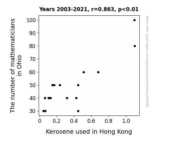 This means 74.5% of the change in the one variable (i.e., Kerosene used in Hong Kong) is predictable based on the change in the other (i.e., The number of mathematicians in Ohio) over the 19 years from 2003 through 2021.