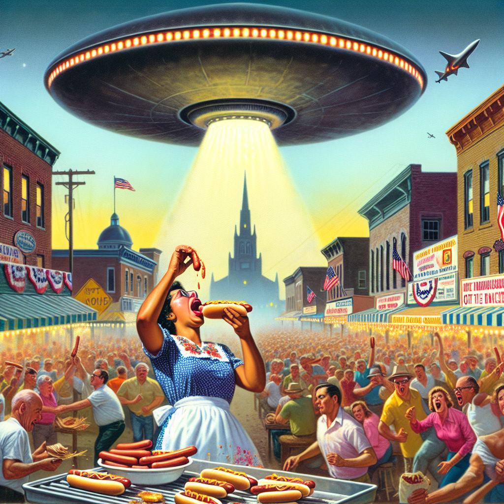 ChatGPT: Generate an image of a festive South Dakota town, with a gigantic UFO hovering in the sky. The streets are packed with alien tourists eagerly lining up to witness Nathan's Hot Dog Eating Competition. The reigning champion stands confidently at the center of a bustling stage, consuming hot dogs at an incredible pace while the crowd cheers on. The aroma of sizzling hot dogs fills the air, blending with the UFO's hum, creating an otherworldly atmosphere as the champion and the alien tourists engage in a close encounter of the hunger kind.