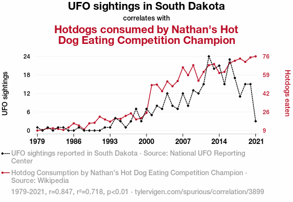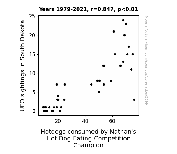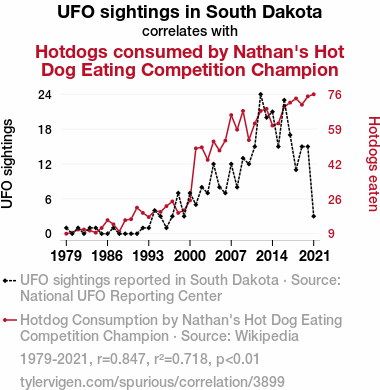 UFO sightings, hotdog consumption, Nathan's Hot Dog Eating Competition, correlation coefficient, statistical significance, South Dakota, National UFO Reporting Center, Wikipedia, extraterrestrial visitors, culinary choices, champion's appetite