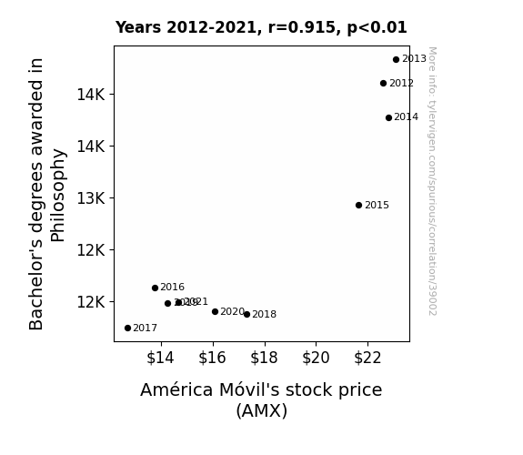 This means 83.7% of the change in the one variable (i.e., América Móvil's stock price (AMX)) is predictable based on the change in the other (i.e., Bachelor's degrees awarded in Philosophy) over the 10 years from 2012 through 2021.