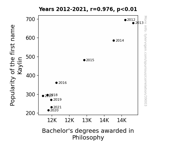 This means 95.2% of the change in the one variable (i.e., Bachelor's degrees awarded in Philosophy) is predictable based on the change in the other (i.e., Popularity of the first name Kaylin) over the 10 years from 2012 through 2021.