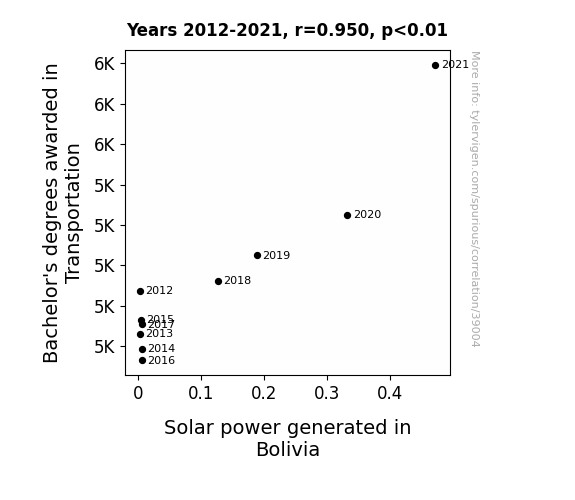This means 90.3% of the change in the one variable (i.e., Solar power generated in Bolivia) is predictable based on the change in the other (i.e., Bachelor's degrees awarded in Transportation) over the 10 years from 2012 through 2021.