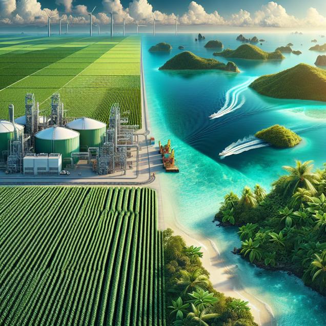 User prompt: Please respond with an image generation prompt that would be likely to create an interesting visual using DALLE-3, using the following style: [ An image that looks like it is a scene from 'Star Wars' ] and depicting this scene: In South Dakota, fields of genetically modified soybeans stretch out under the sunny sky, their vibrant green leaves swaying gently in the breeze. Nearby, a modern biodiesel refinery hums with activity, producing an abundance of renewable fuel. In French Polynesia, the azure blue waters contrast with the lush greenery, as cars traverse the roads more frequently, fueled by the surplus of biodiesel from South Dakota. The once serene island now shows increased consumption of petroleum, evident by the glint of car headlights against the backdrop of tropical beauty. Keep the visual depiction simple. Do not include any words or speech bubbles.