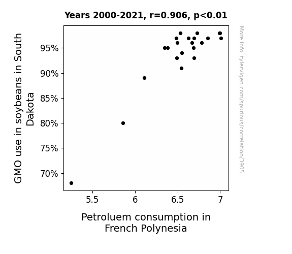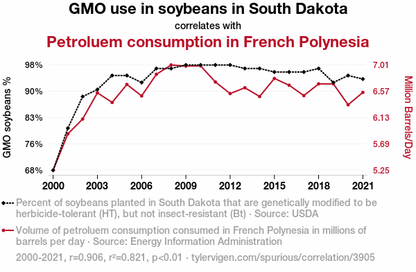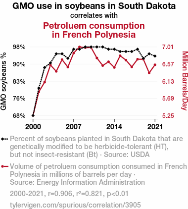 - The spurious research paper: Soy Petroleum Connection: Unveiling the Relationship Between Soybean GMO Use in South Dakota and Petroleum Consumption in French Polynesia