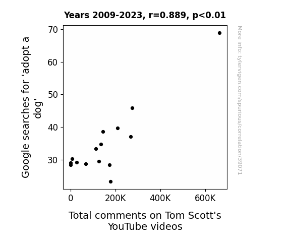 This means 79.1% of the change in the one variable (i.e., Total comments on Tom Scott's YouTube videos) is predictable based on the change in the other (i.e., Google searches for 'adopt a dog') over the 15 years from 2009 through 2023.