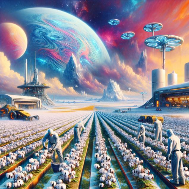 ChatGPT: Create an image that looks like it is a scene from 'Star Wars' but with a twist. Depict in this scene: In a Texas cotton field, farmers can be seen tending to non-GMO cotton plants under the bright sun. Meanwhile, in Finland, a gas station stands with fewer cars lining up for fuel, leading to a decrease in gasoline pumped. In the background of both scenes, a large banner reading "No GMO-themed parties" is being taken down, symbolic of the declining demand for genetically-enhanced energy drinks. The setting of the image should have a futuristic and cosmic aspect, resembling the iconic Star Wars universe, with the cotton field and gas station integrated into the otherworldly landscape. The image should exude a sense of juxtaposition between earthly activities and a space-age environment.