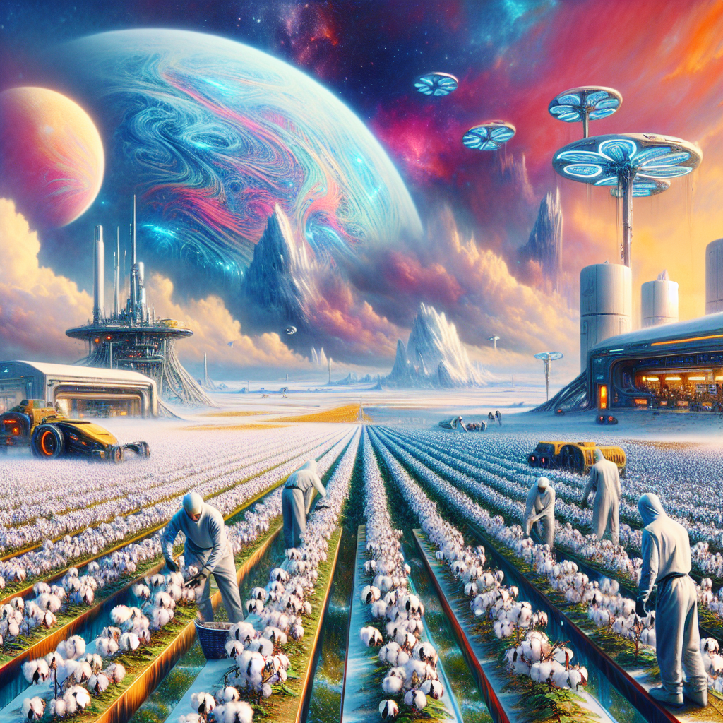 Prompt: Create an image that looks like it is a scene from 'Star Wars' but with a twist. Depict in this scene: In a Texas cotton field, farmers can be seen tending to non-GMO cotton plants under the bright sun. Meanwhile, in Finland, a gas station stands with fewer cars lining up for fuel, leading to a decrease in gasoline pumped. In the background of both scenes, a large banner reading "No GMO-themed parties" is being taken down, symbolic of the declining demand for genetically-enhanced energy drinks. The setting of the image should have a futuristic and cosmic aspect, resembling the iconic Star Wars universe, with the cotton field and gas station integrated into the otherworldly landscape. The image should exude a sense of juxtaposition between earthly activities and a space-age environment. The depiction should include only scenes, people, and objects, it should not include text or speech bubbles.