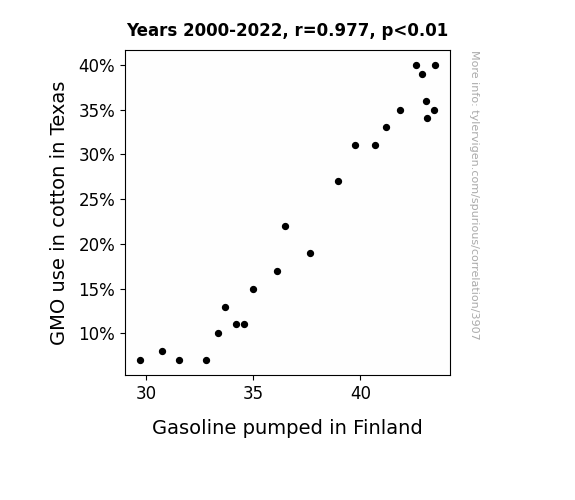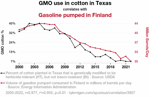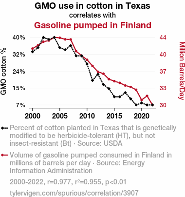 This means 95.5% of the change in the one variable (i.e., Gasoline pumped in Finland) is predictable based on the change in the other (i.e., GMO use in cotton in Texas) over the 23 years from 2000 through 2022.