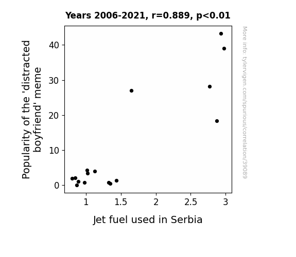 This means 79% of the change in the one variable (i.e., Jet fuel used in Serbia) is predictable based on the change in the other (i.e., Popularity of the 'distracted boyfriend' meme) over the 16 years from 2006 through 2021.