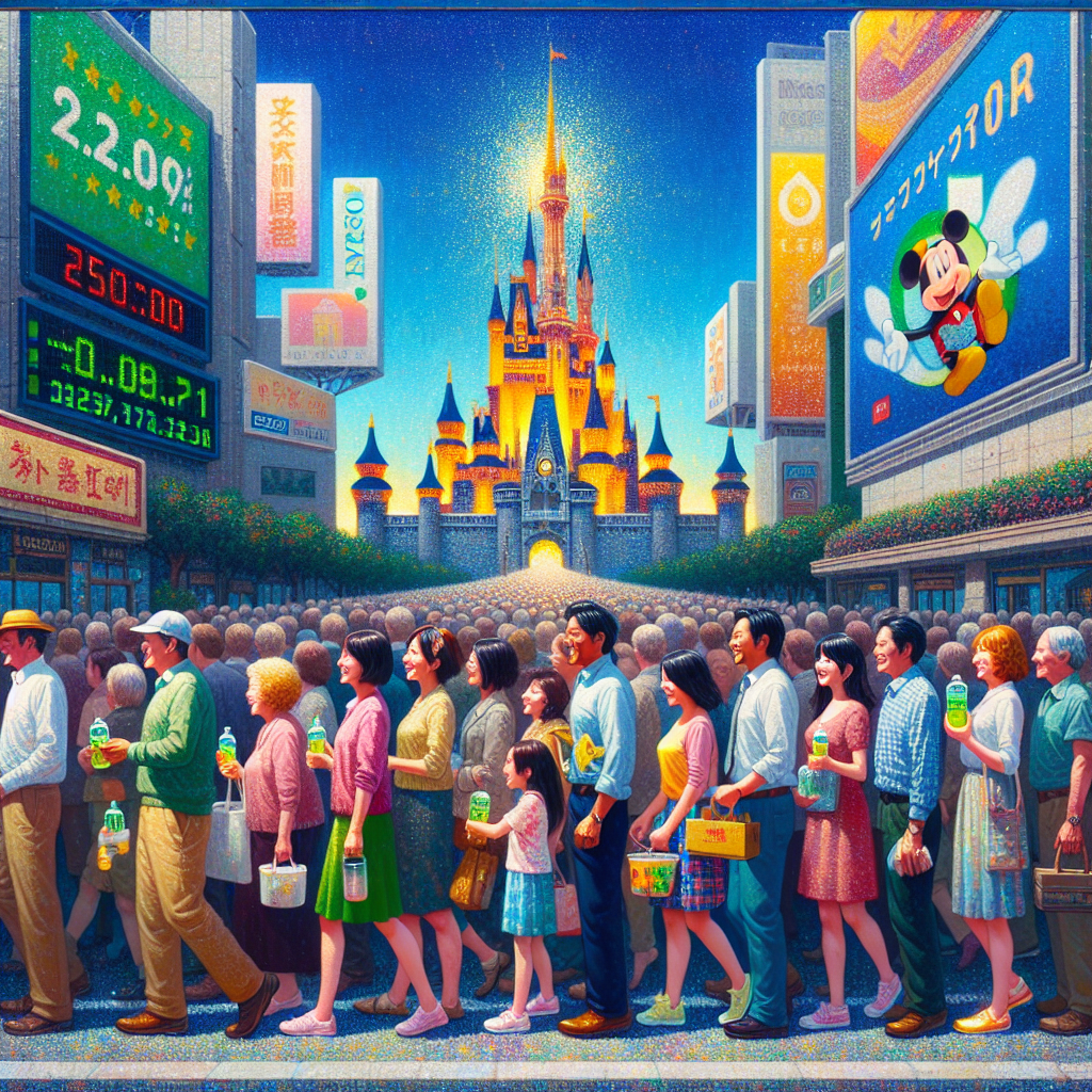 ChatGPT: [ Cutsy graphics ] Generate an image of a quaint and vibrant cityscape, bustling with activity. People are strolling along the boulevard carrying twinkling bottles of glimmering water, their vibrant attire reflecting the sun's rays. In the distance, a towering billboard proudly showcases the iconic castle logo of the Walt Disney Company, drawing the eye with its enchanting allure. Excited visitors form a cheerful line, eagerly anticipating entry into the magical realm of Disney, while a stock price ticker nearby reflects a steady upward trend, signaling prosperity in this lively urban setting.