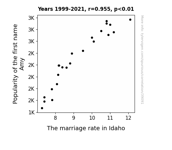 This means 91.2% of the change in the one variable (i.e., The marriage rate in Idaho) is predictable based on the change in the other (i.e., Popularity of the first name Amy) over the 23 years from 1999 through 2021.