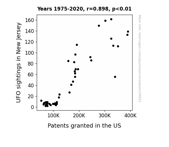 This means 80.7% of the change in the one variable (i.e., Patents granted in the US) is predictable based on the change in the other (i.e., UFO sightings in New Jersey) over the 46 years from 1975 through 2020.