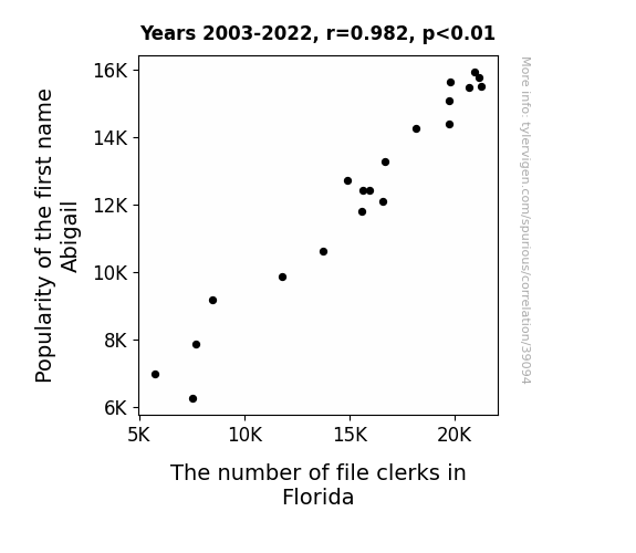 This means 96.4% of the change in the one variable (i.e., The number of file clerks in Florida) is predictable based on the change in the other (i.e., Popularity of the first name Abigail) over the 20 years from 2003 through 2022.