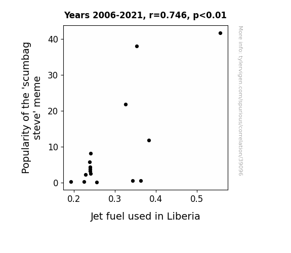 This means 55.6% of the change in the one variable (i.e., Jet fuel used in Liberia) is predictable based on the change in the other (i.e., Popularity of the 'scumbag steve' meme) over the 16 years from 2006 through 2021.